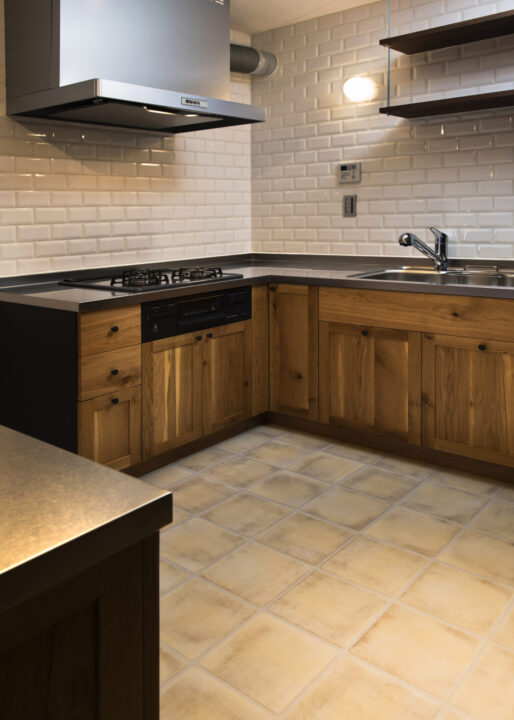 タイルを敷き詰めた壁とステンレスの天板のキッチン台がレトロな雰囲気を演出してくれる