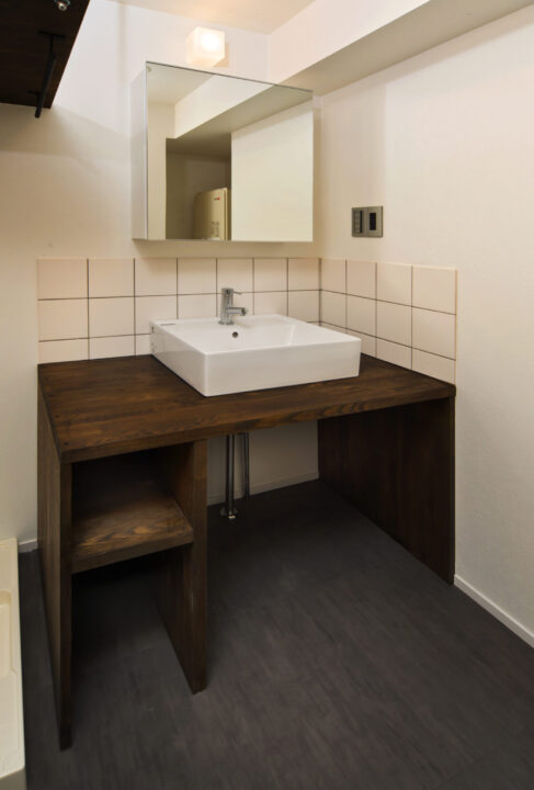 コンパクトでありながら使い勝手の良い洗面台。こちらにもタイルをあしらえてレトロ感を演出