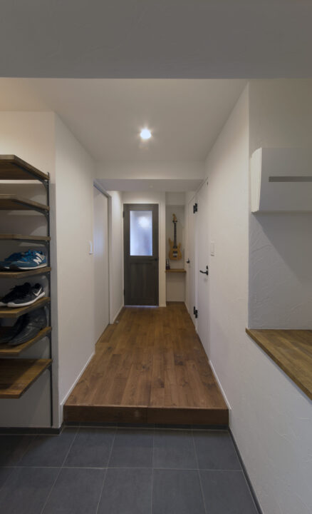 広々とした土間のある玄関は収納力抜群。空間を活用してギターを魅せる収納も暮らしを楽しむ工夫の一つ