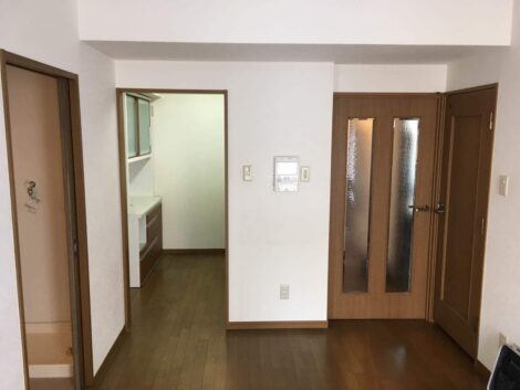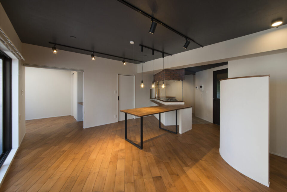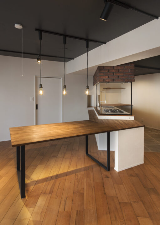 テーブルと一体になったキッチンで曲げることにより、台形に近い形の部屋でも使い勝手の良い設計に