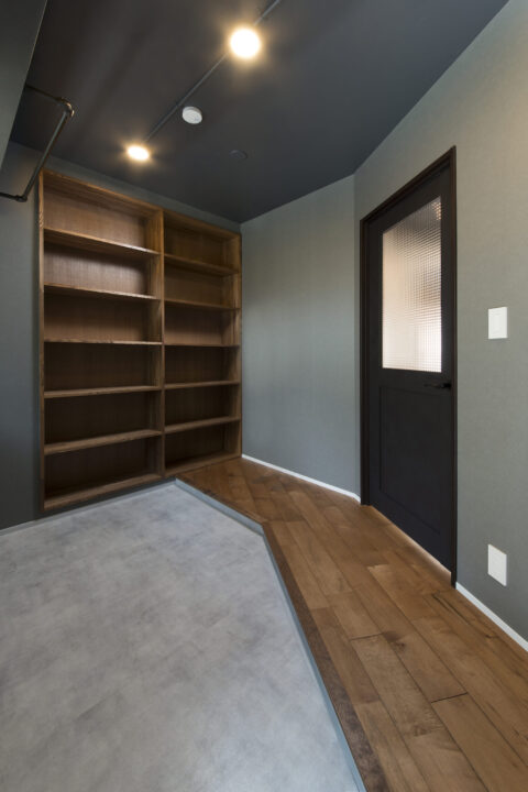 広々とした土間と書棚のある玄関。グレー系の色味でシックなデザインに仕上げた