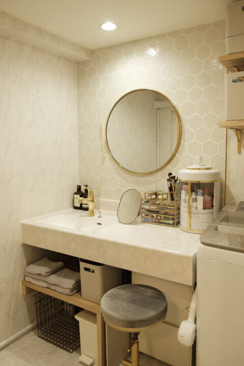 高級感溢れるデザインの洗面台。椅子に座って身支度ができる高さ・広さに調整されたママが嬉しい設計