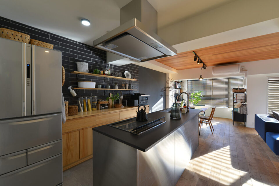 ダーク系のカラーのクロスを採用したスタイリッシュなキッチン。広々としたアイランドキッチンは使い勝手◎