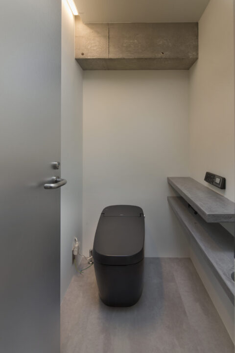 モノトーンデザインのトイレ。スイッチもブラックにし、造作棚もグレーを採用して統一感を出している