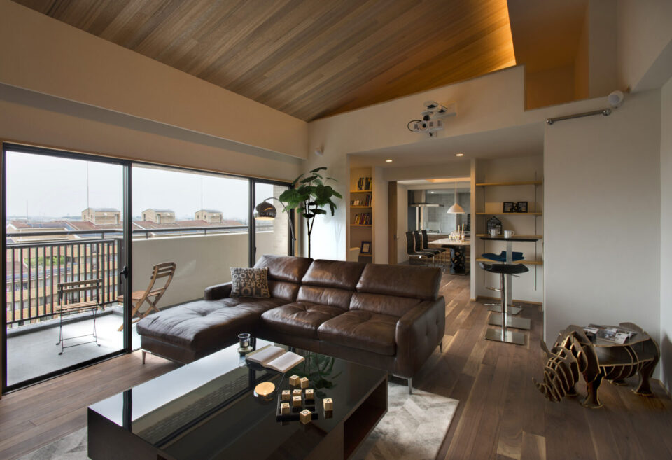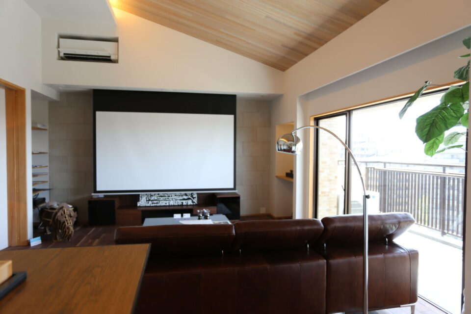 リビングの壁面には大きなスクリーンを設置。休日に家族で映画やドラマを見て至福の時間を過ごす