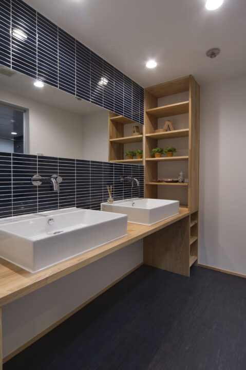 「木質感とグレーのタイルでホテルライクな仕上がり」