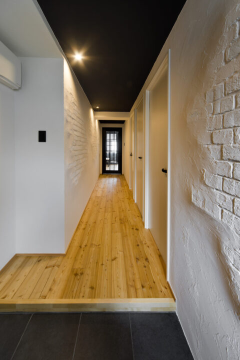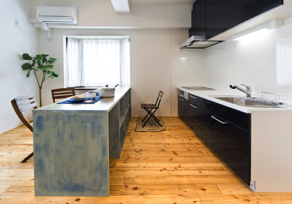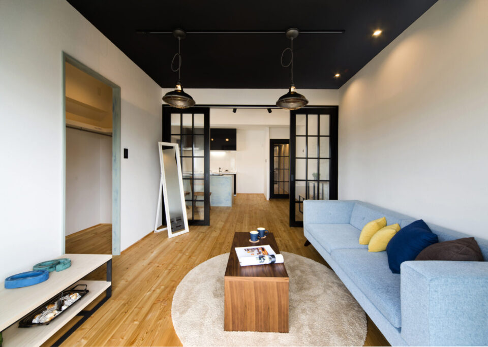 LDKは、光を取り入れつつ程良く空間を仕切る「ガラス間仕切り」を採用し開放的な空間に仕上げた