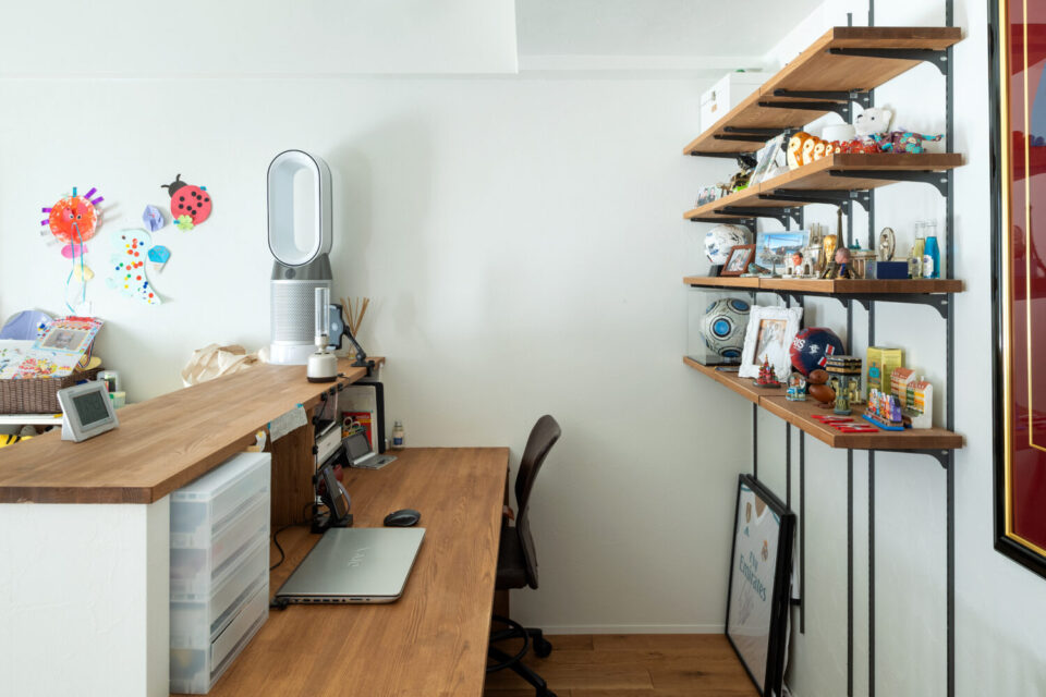 キッチン横のワークスペース。壁面にはディスプレイコーナーも設け、趣味も楽しめる空間。