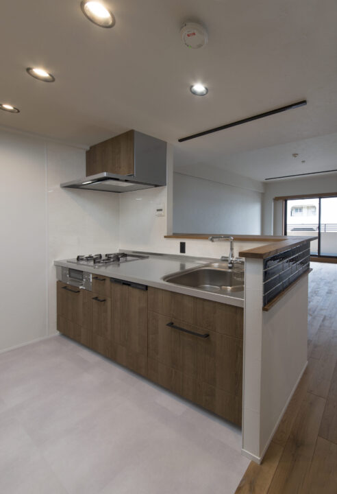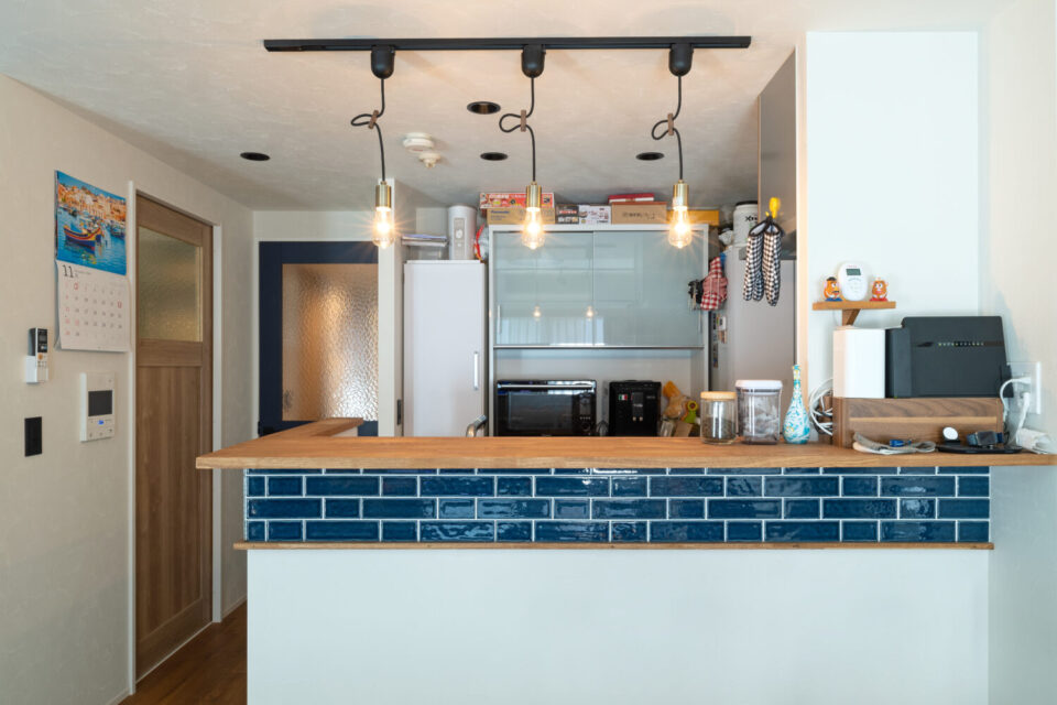 カウンターのタイルをアクセントに異素材をバランスよく組み合わせて仕上げた