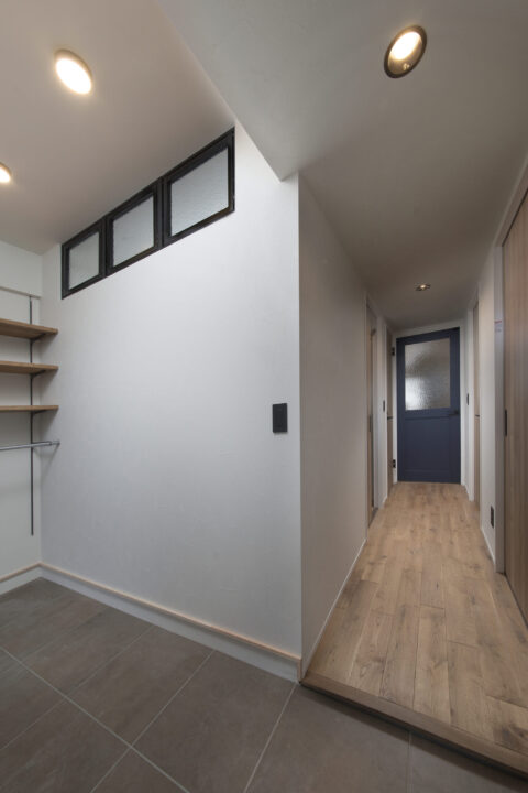 グレー×黒×木で引き締まったデザインの玄関。可動式の棚を壁面に設け、玄関の床がスッキリと片付く工夫が凝らされている