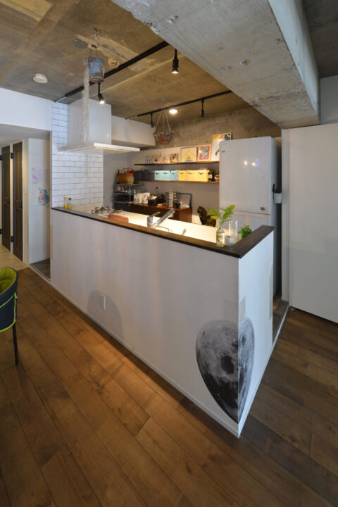 家族とのコミュニケーションが広がるカウンターキッチン。壁面の魅せる収納には思い出の写真を。