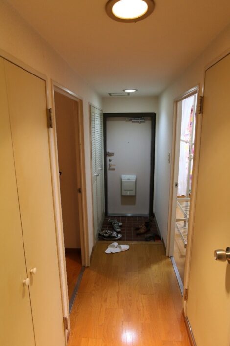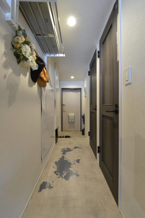 グレーで統一された廊下。床はあえて無骨さを残し、美しすぎない雰囲気に仕上げた。
