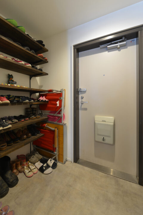 玄関には便利な可動式の棚を設けた。玄関を広く設けることで大きなものも置ける収納力を実現。