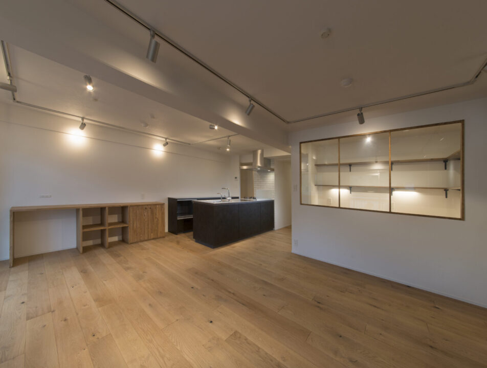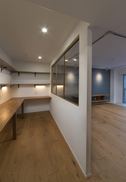 視線が抜けて、光が通う。ガラスの室内窓が、LDKとリモートワークスペースの程良い距離感を作り出してくれている