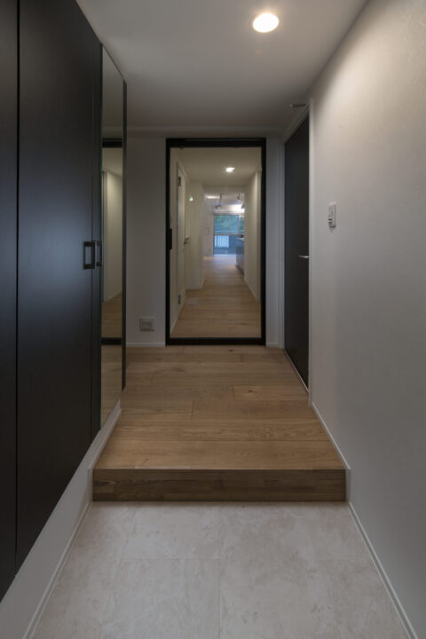 玄関を開けた瞬間、木の香りと落ち着きが迎えてくれる。一面ガラスのドアが、リビングとのつながりを作り出してくれる