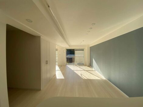 LDKには、無垢床の温かみが広がる。ブルーのアクセントウォールが、白と木を基調としたデザインの中に映える