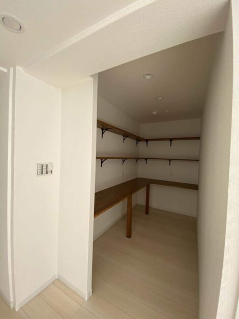 リビングに隣接したリモートワークスペースは、家族とのつながりを感じながらも集中できる“こもり感”のある場所