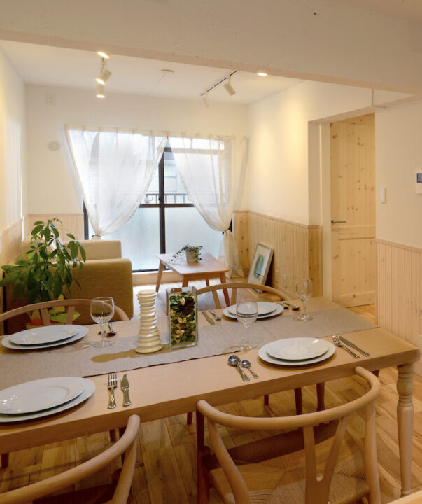 日常を丁寧に楽しむ、やさしい光の入るダイニング。カーテン越しにふんわり差し込む自然光と、無垢材の家具が心を穏やかに