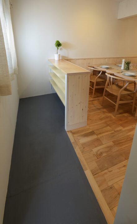 空間に寄り添う、さりげない収納。腰壁と素材を合わせた造作棚が、空間の一体感を高めながら使い勝手も確保してくれる