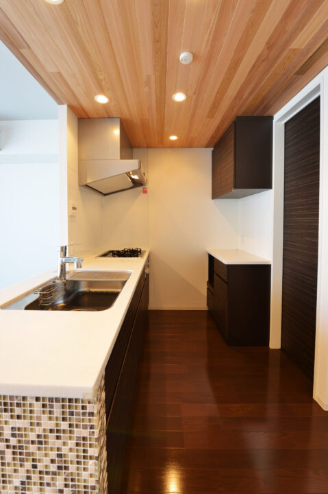 木のぬくもりが包むキッチン。モザイクタイルのカウンターとダークブラウンの収納が空間を引き締め、機能美とデザイン性を両立