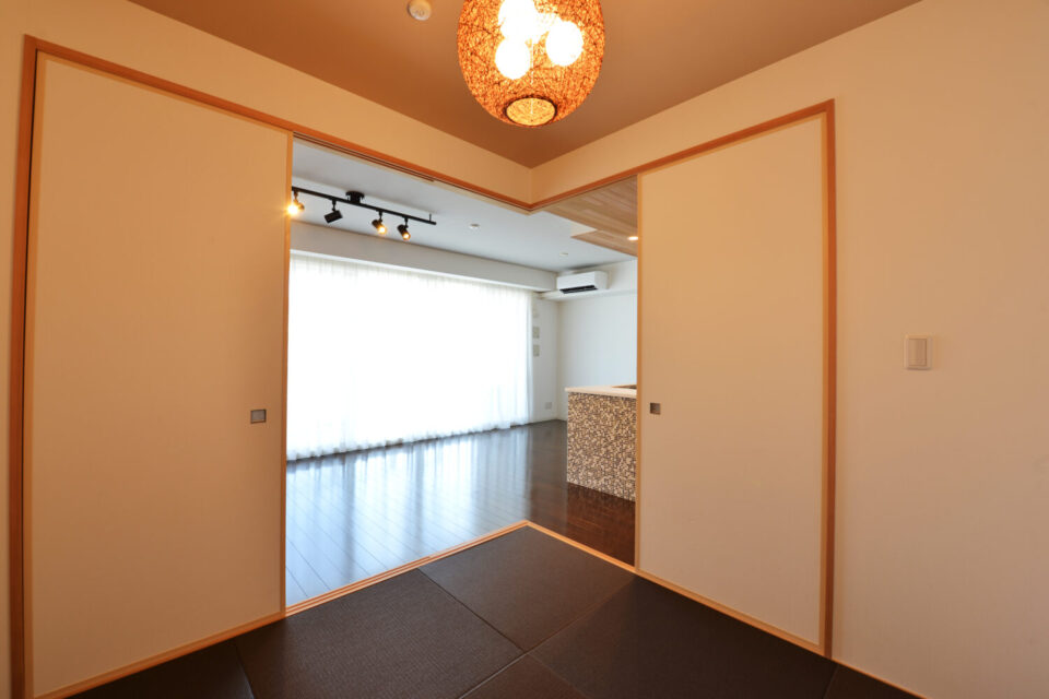和の静けさと洋の開放感が、やさしくつながる。引き戸を開ければひとつながりの大空間、閉じれば落ち着きのある和の空間に
