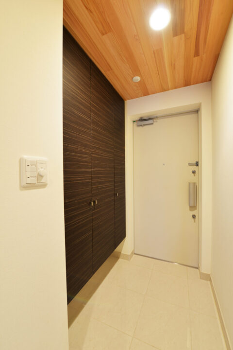 天井の木貼りが、玄関にぬくもりをプラス。ダークブラウンの収納が空間をスタイリッシュにまとめ住まいの第一印象を美しく演出