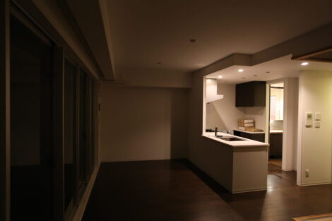 素材の個性が引き立つ、上質なミックススタイルのLDK。艶感あるフローリングに、モザイクタイルや板張りの壁がアクセントに
