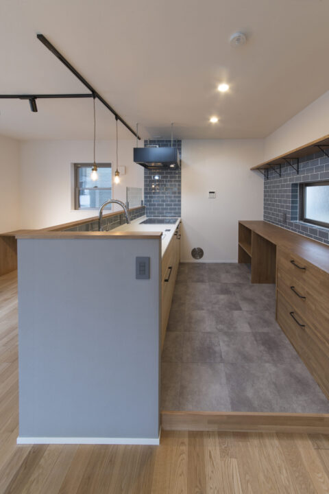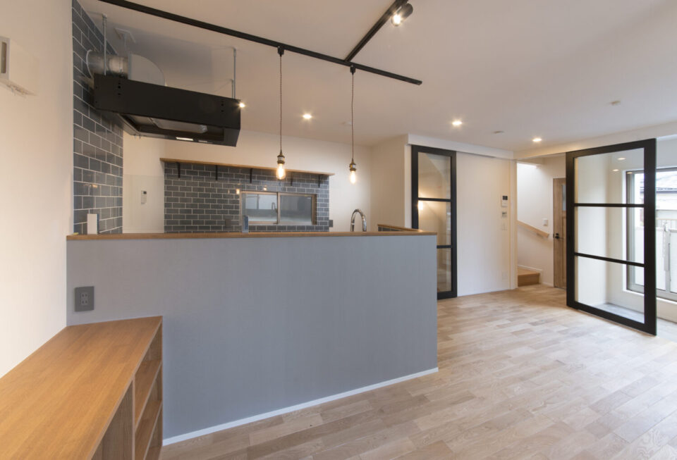 ブルーグレーのタイルとペンダントライトが映えるカフェのようなキッチン。ガラスドアや無垢の床が、開放感と温もりを両立させる