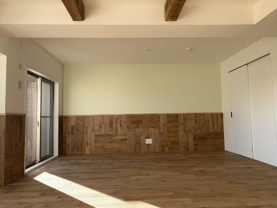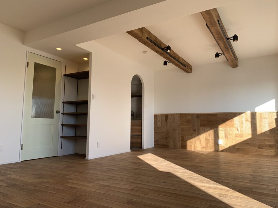 白壁と木梁が美しく調和するLDK。差し込む陽光が床材の温もりを際立たせ、シンプルながらも上質な空間に仕上げっている