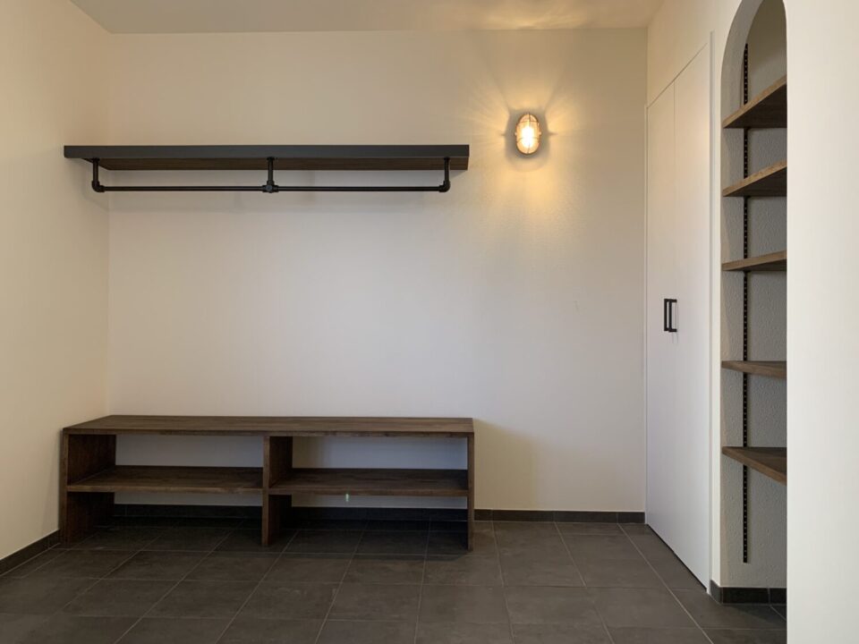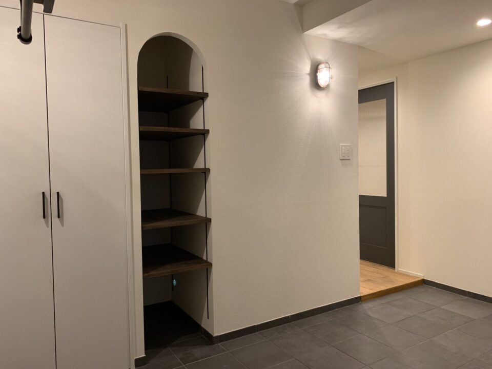 アーチ型の収納棚がアクセントになった玄関ホール。シンプルな中に遊び心を加えたデザインに仕上がっている