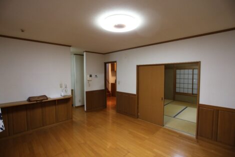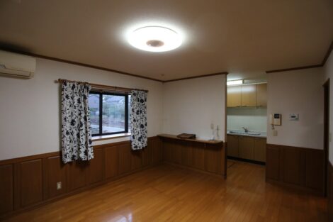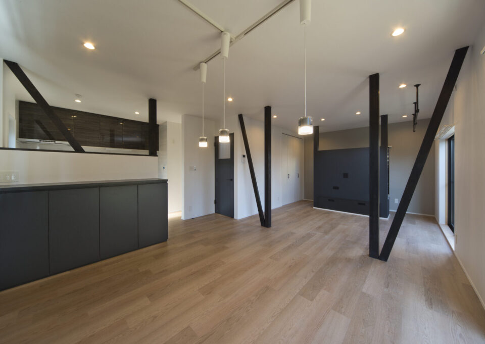 広々としたフローリングと、大胆に配置された柱が印象的なリビングダイニング。ペンダントライトが温かみのある空間を演出