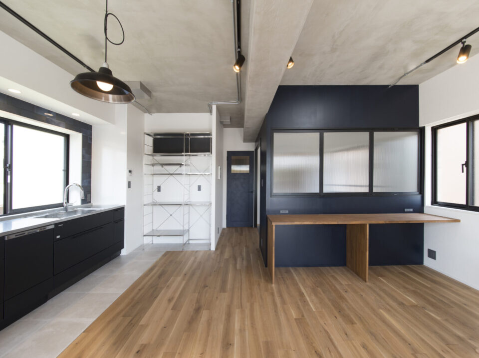 無駄をそぎ落としたシンプルな空間に、木の温もりとブラックのアクセントウォールが映えるリビングダイニング