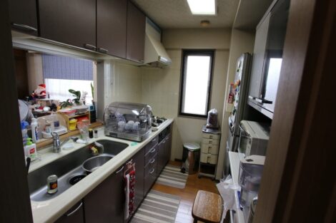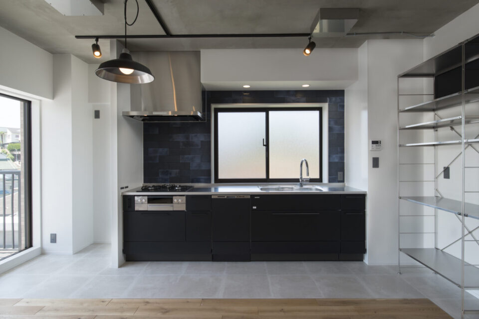 マットブラックのキッチンと艶やかなタイルが織りなす、モダンな空間。機能美とデザイン性を兼ね備えている