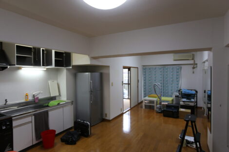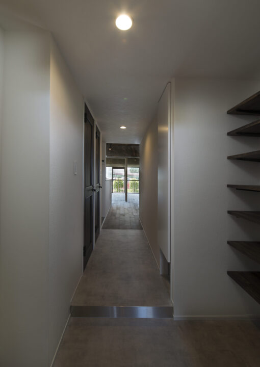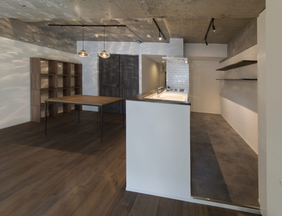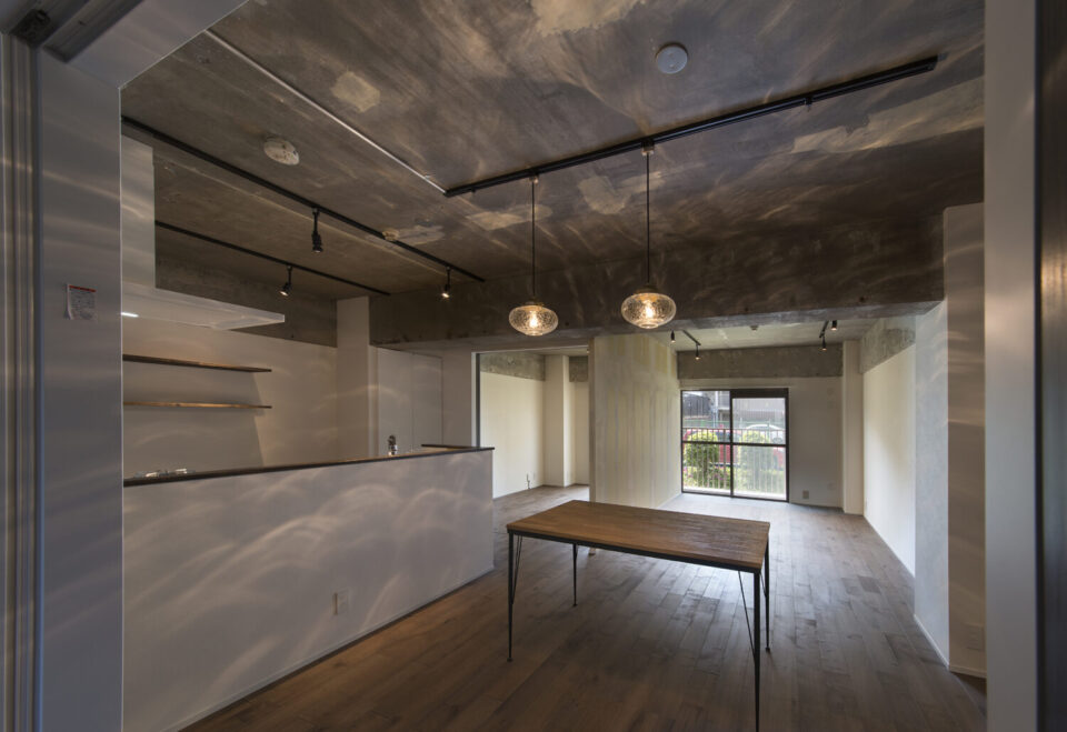無骨さと温もりが共存するリビング。木の質感とコンクリート天井が描く、スタイリッシュな空間