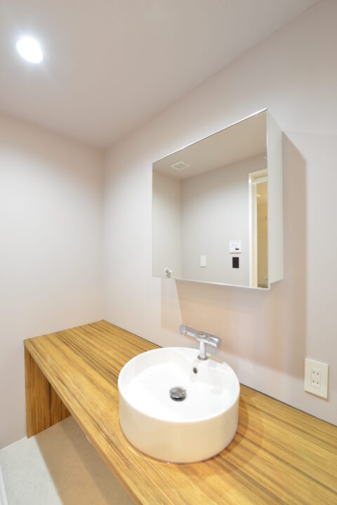 木のカウンターとラウンドボウルが調和する洗面スペース。余白を活かしたデザインが、朝の支度も夜のリラックスも心地よい時間に