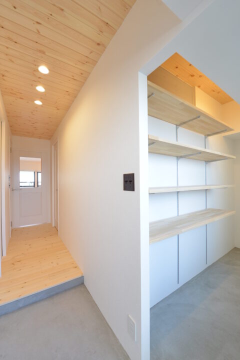 天井まで木で仕上げた玄関ホールは、自然素材の香りが心地よい。すっきりとしたオープン棚が、暮らしをスマートにサポート