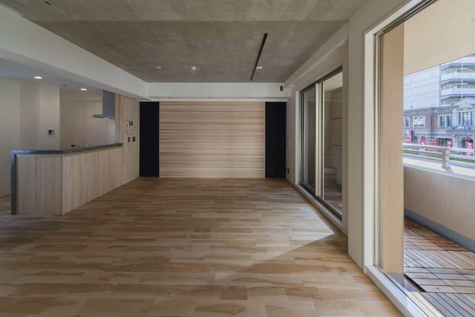 ダークグレーの天井と無垢床のコントラストが美しいLDK。大開口から差し込む光が、時間ごとに異なる表情を描き出す