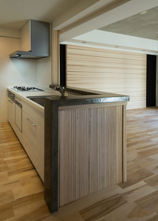 木目と金属の質感を融合させたキッチンカウンター。素材美を際立てつつ、住まい全体のトーンに合わせてデザインしている