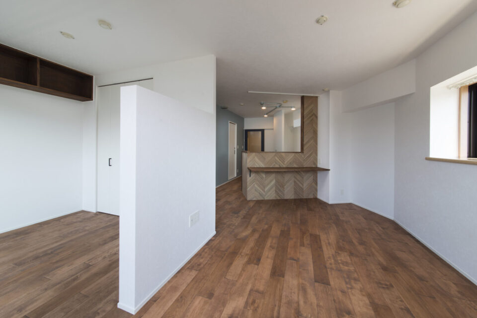 白壁とナチュラルブラウンのコントラストが、開放感と落ち着きを同時に演出。完全に仕切らないことで圧迫感のない設計に