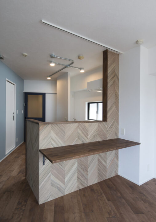 ダイニング側に設けたカウンターは、家事の合間にひと息つくカフェスペースにも。ヘリンボーン柄の木目がインテリアのアクセント