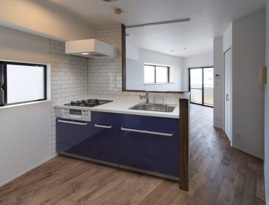 白いサブウェイタイルと深みのあるブルーのキッチンが調和した上質な空間。リビングとの一体感を楽しめるオープンスタイル