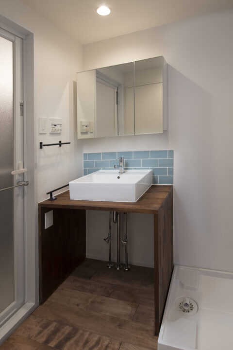 シンプルなスクエアボウルと木の天板が印象的な洗面台。淡いミントブルーのタイルが爽やかさを添え、朝の身支度が楽しくなる空間