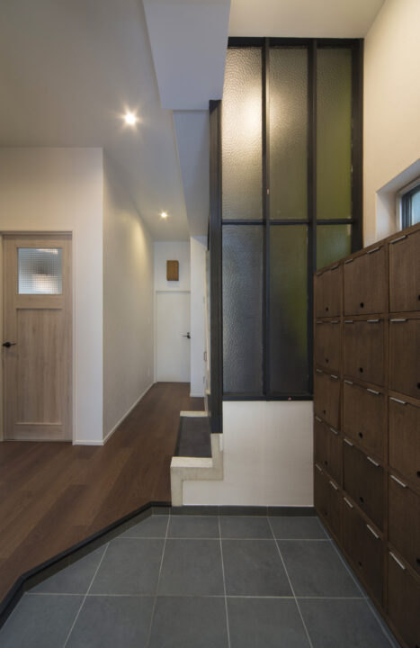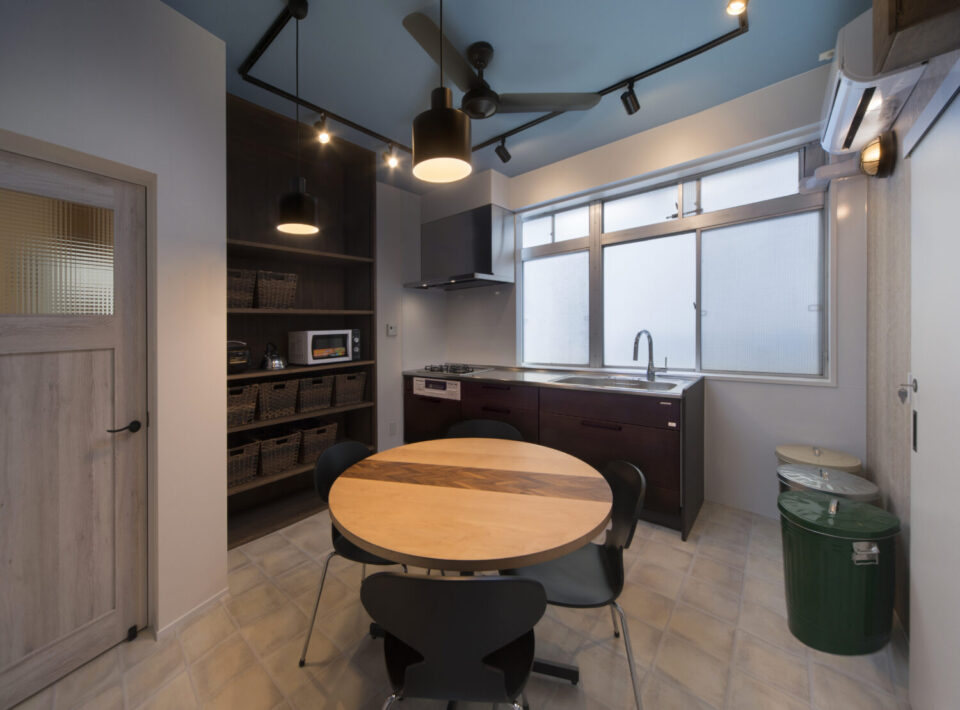 木の温もりと落ち着いた色調がやさしく溶け合うダイニングキッチン。天井のアクセントカラーと照明が明るい空間に演出してくれる