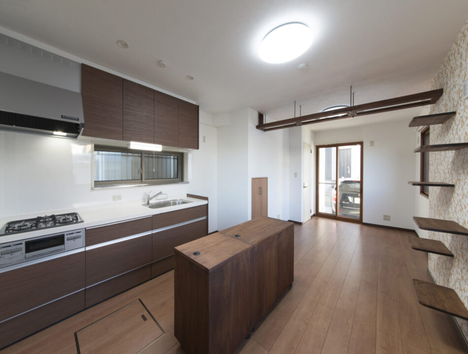 落ち着いた木目のキッチンと、作業性の高いアイランドカウンター。料理・配膳・片付けまでをスムーズにつなぐ動線設計が嬉しい