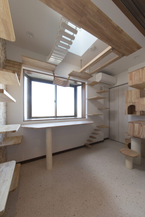 窓辺のカウンター、空中回廊、隠れ家スペースまで、猫の習性を丁寧に読み取った設計。猫も人も心からくつろげる“共生の部屋”