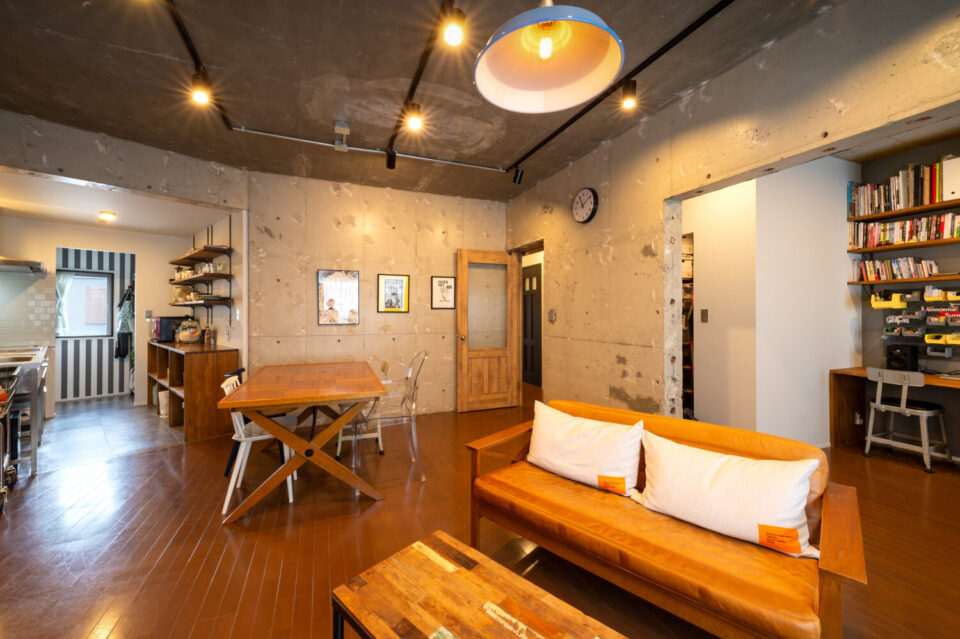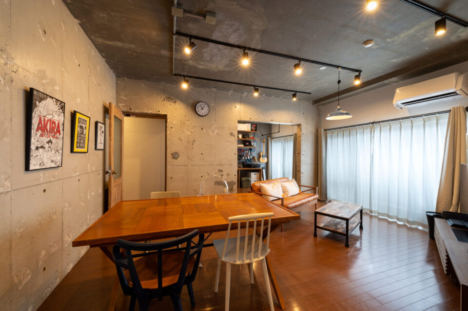 躯体現しのラフなコンクリート壁に、温かみのある無垢テーブルとレザーソファが映えるリビングダイニング