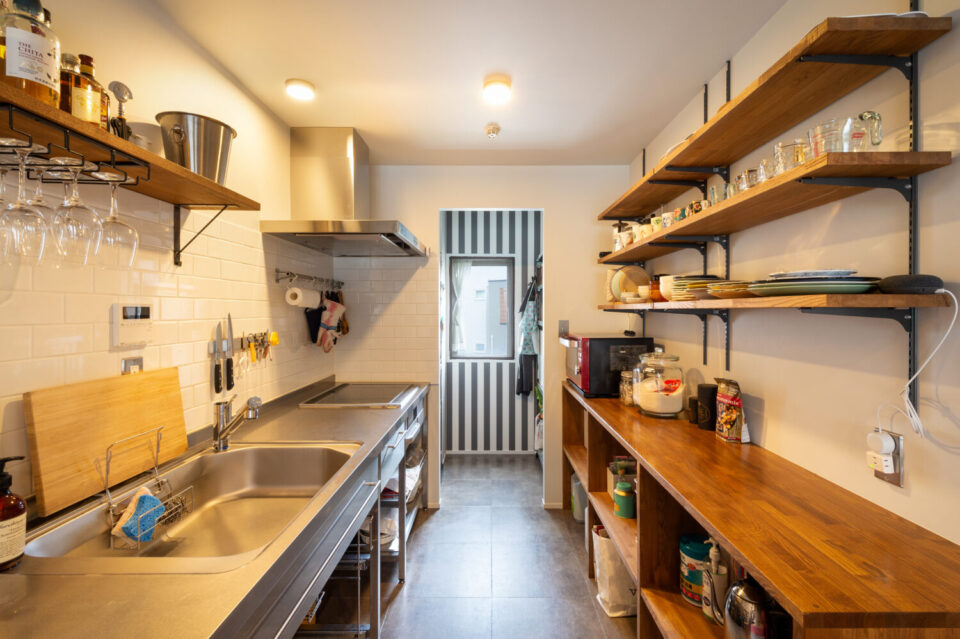 ステンレスカウンターとオープン棚が印象的なキッチン。お気に入りの食器を“見せて収納”することで使い勝手とデザイン性を両立