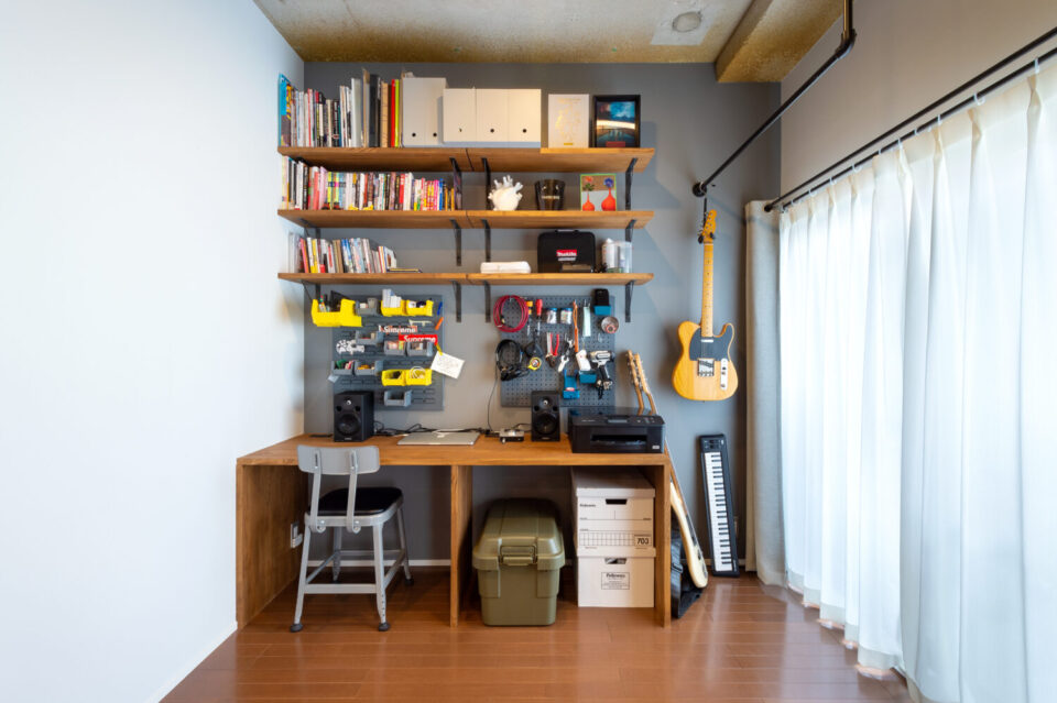 造作カウンターと可動棚でつくり込んだワークスペース。書籍やツール、楽器まで美しく収納できる壁面が作業効率と創造性を高める