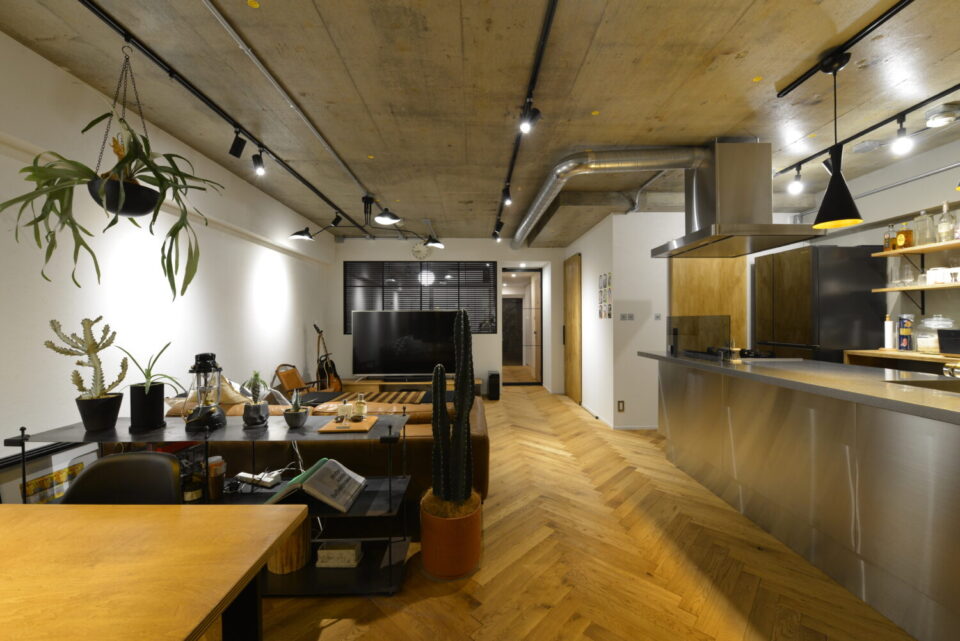 「躯体現しとアイアン調の照明で大人空間に」