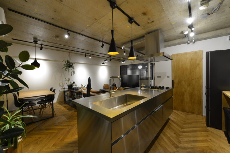 コンクリート天井、ステンレスキッチン、無垢ヘリンボーン床。異素材を掛け合わせながらも落ち着くのは余白を大切にしているから